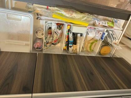 ここも観物などを四角く区切って上からみてすぐに分かるように収納すると2度買いが減ります