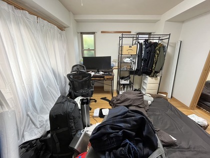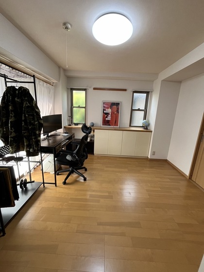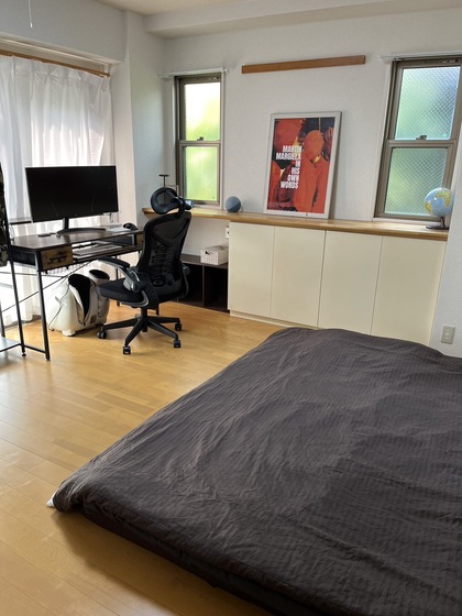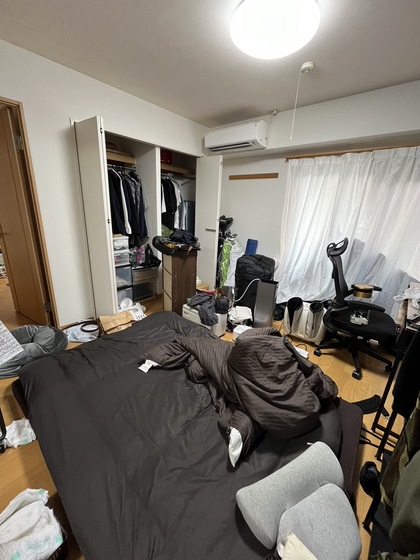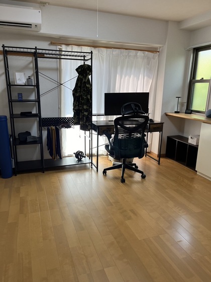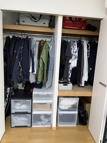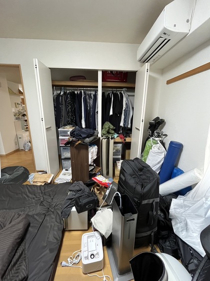 ・床に物を置きたくない⇒物の量を減らし、キャンプ用品や家族のキャリーバッグなどはリビング横の収納に入る物は移動させ、この部屋にはご主人のモノだけにする