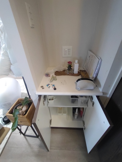 購入時に棚を付けてもらい、薬や文具、家族の書類などを収納しています