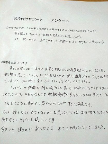 もっと捨てなきゃ片付かないかとも思っていたので、ある物をすっきりと片付けていただいて嬉しいです。