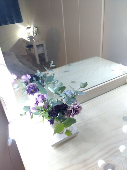 鏡越しに見えるテーブルも物置にあったモノを移動