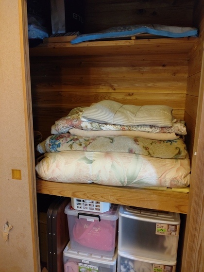お布団を仕舞うのが面倒くさいということで、畳んではいらっしゃいましたが、そのままではどうしてもだらし無い感じが否めません