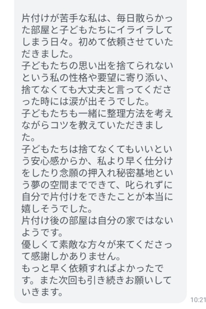 そんなご家庭を片付けのプロ2人チームでお伺いして一気に整えます。忙しいママにはとにかく時間がない。休みが取れない。