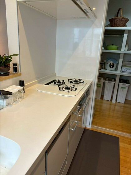 ↑コンロ周りは防災のためにもスッキリと何も置かない。